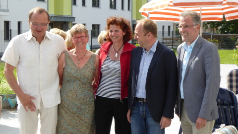 Unter dem Motto "Leben im Alter" wurde die im Mehrgenerationenhaus die Einweihung gefeiert: Horst und Silvia Belter, Bauleiterin Monika Brölingen, Jörg Wiskirchen von G+S Wohnbau und Bürgermeister Dr. Uwe Friedl (v.l.).